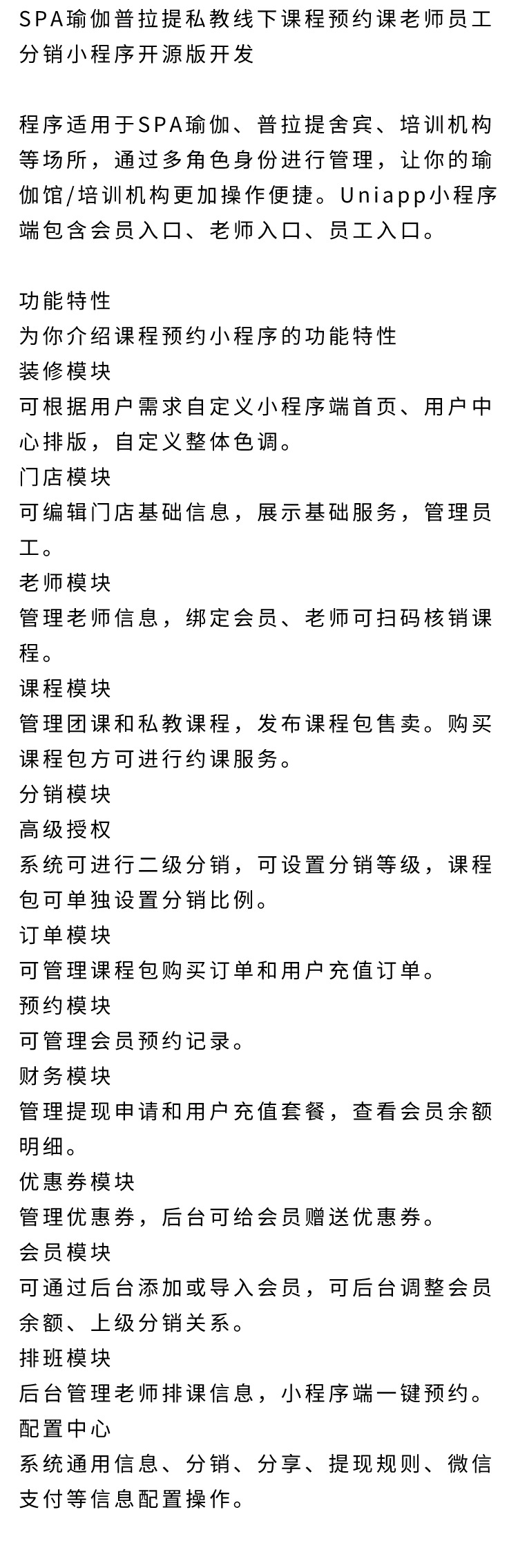 SPA瑜伽普拉提私教线下课程预约课老师员工分销小程序开源版开发